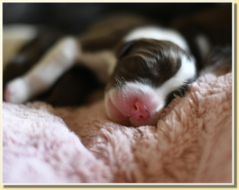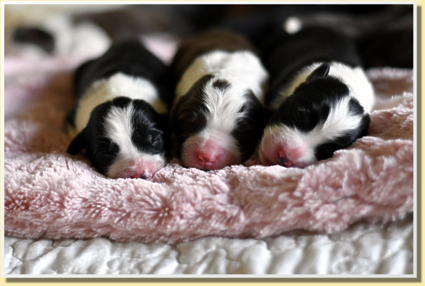Es sind 6 Jungs und 3 Mädchen mit Geburtsgewichten zwischen 350g und 410g, was für 9 Welpen sehr hohe Gewichte sind und die hatte man ihr aber auch angesehen! Alle sind putzmunter, fit und herzallerliebst!