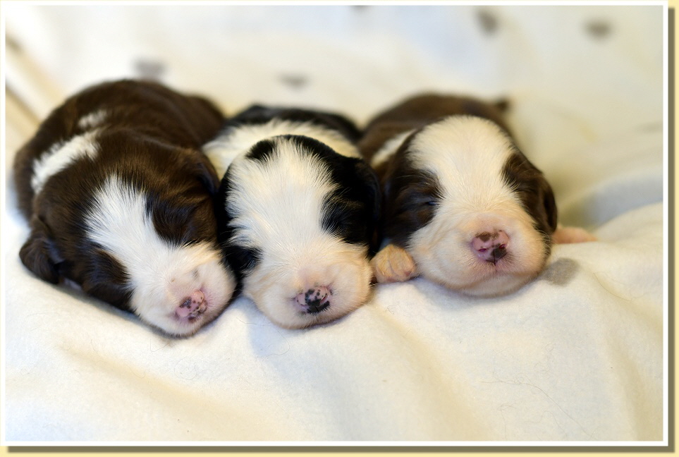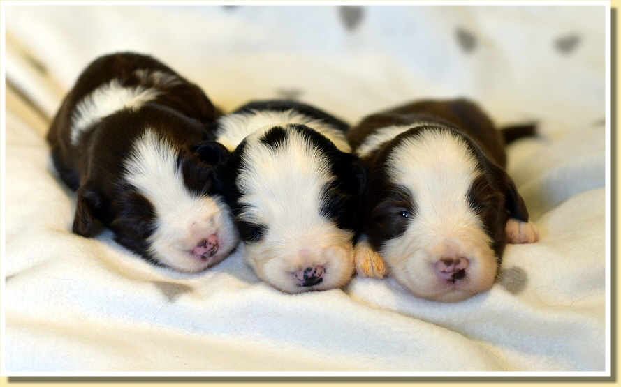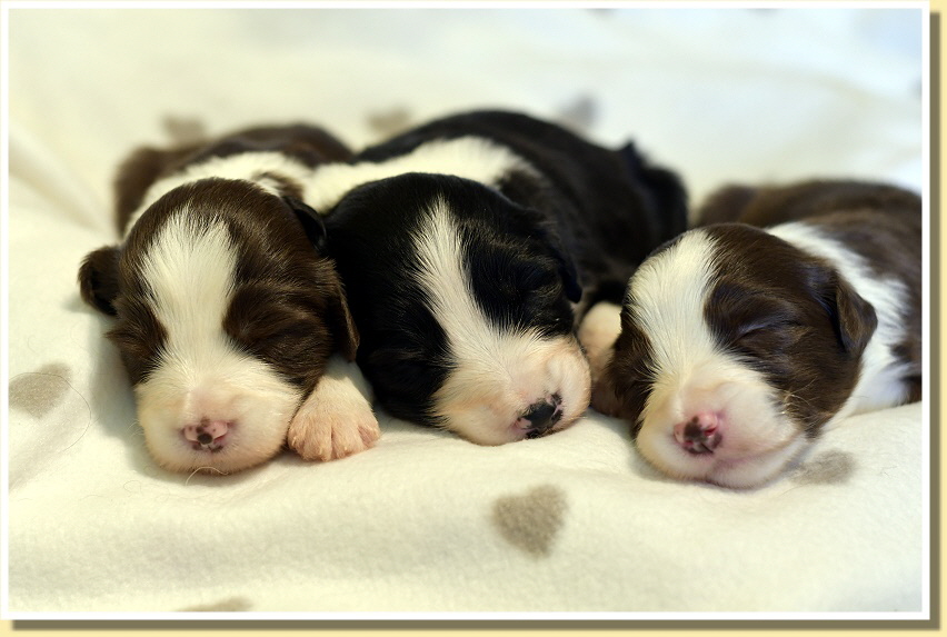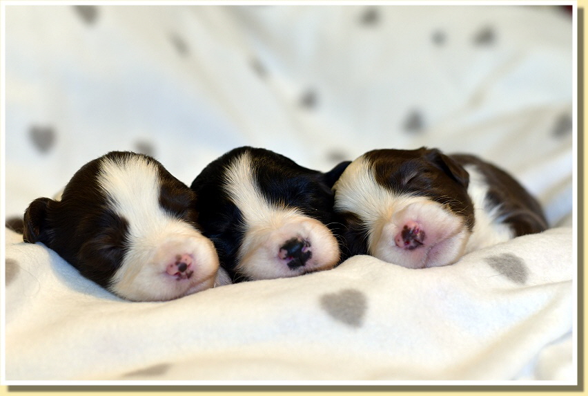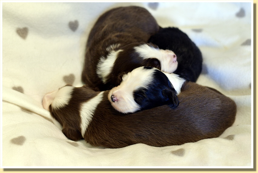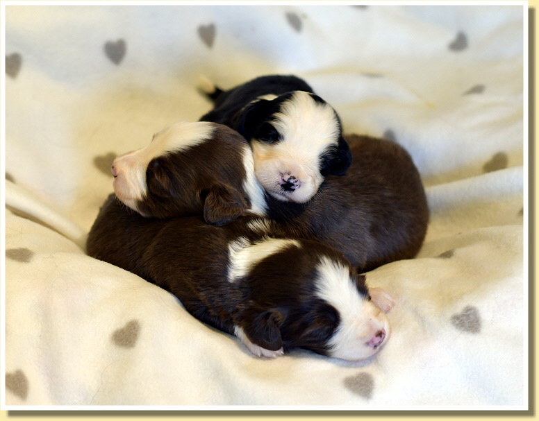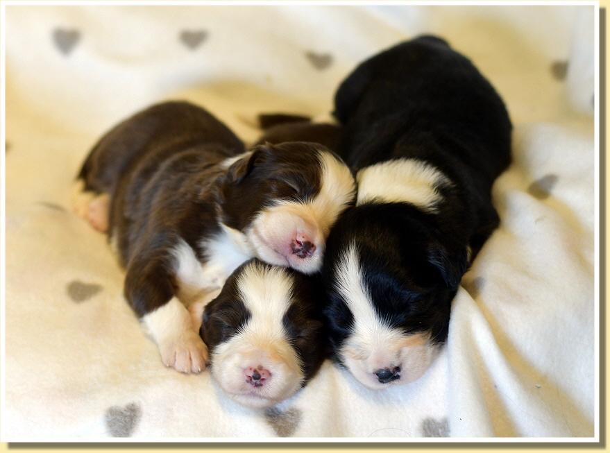 Susy ist sehr entspannt, was Besuche der anderen Rudelmitglieder betrifft und alle dürfen z.B. beim täglichen Wiegen zuschauen. Alle haben bereits die Äuglein geöffnet und wie immer geht dann die Entwicklung der Kleinen rasant voran. Sie spielen schon ganz goldig miteinander, knabbern aneinander rum und sind insgesamz schon richtig mobil! Deshalb brauchen sie bald auch mehr Platz und sie ziehen zu Leellys Welpen ins Welpenzimmer. Mal schauen, wie die Mamas das finden!
