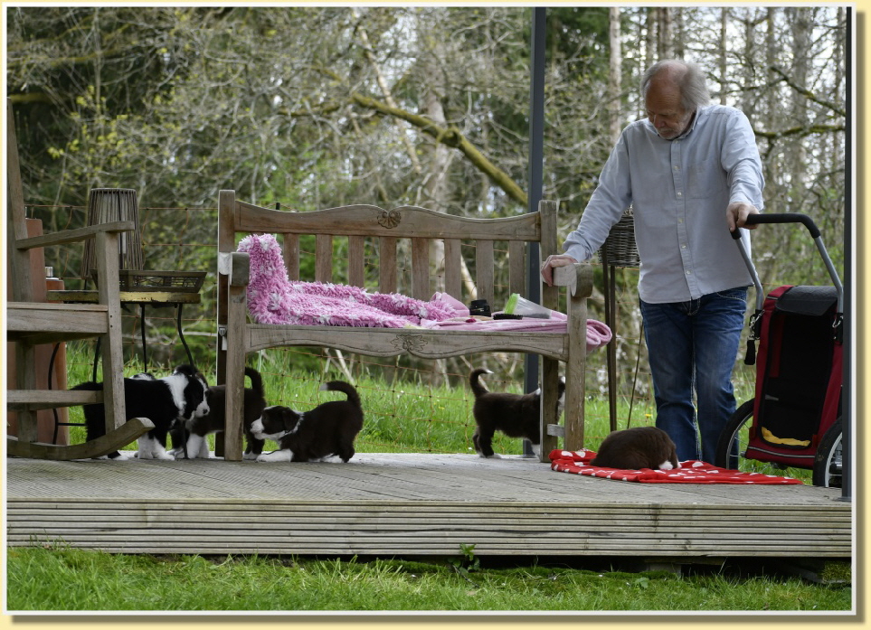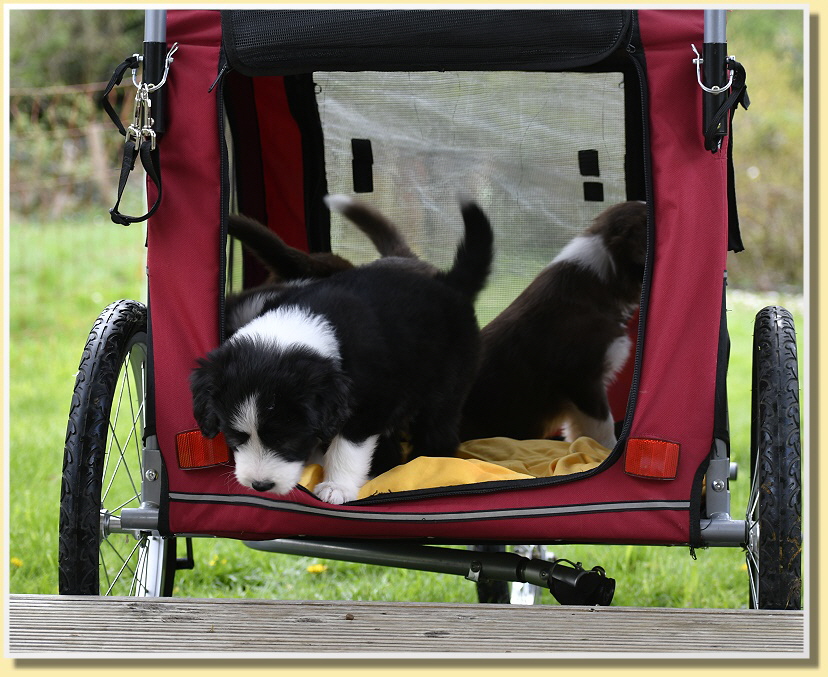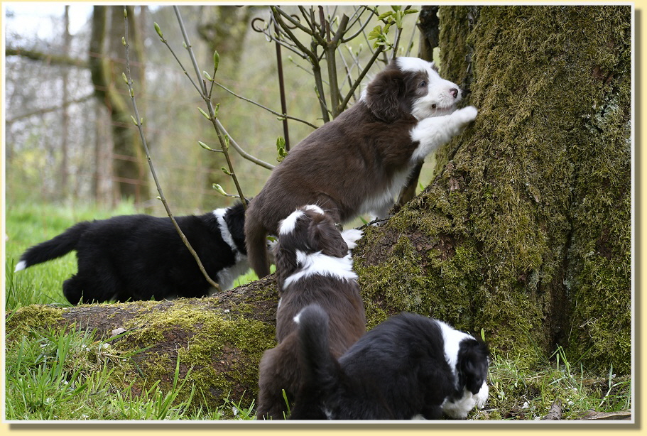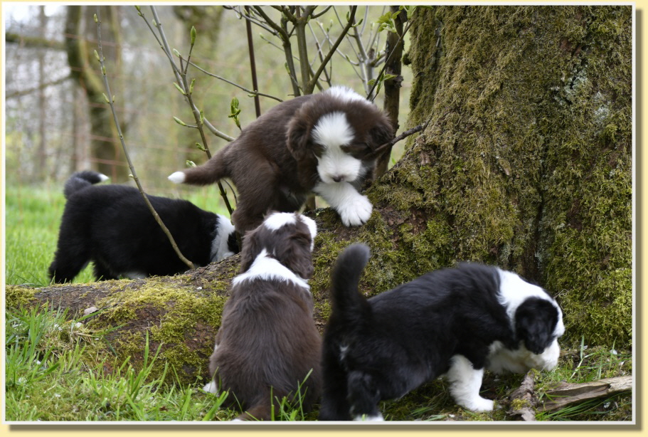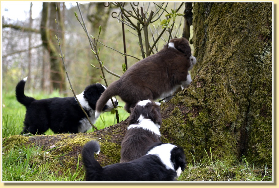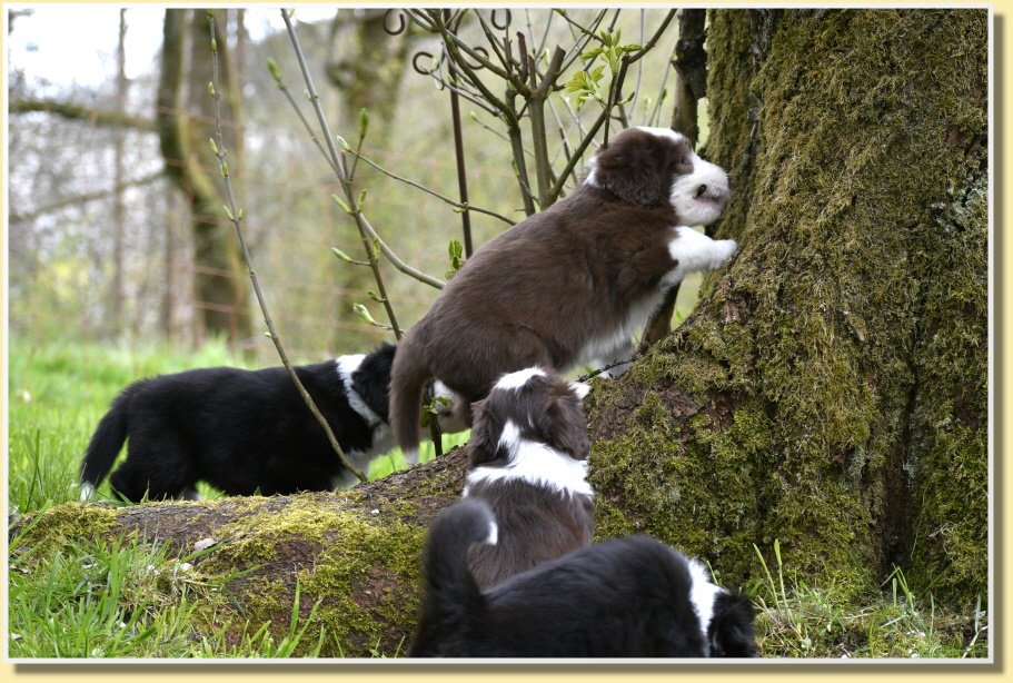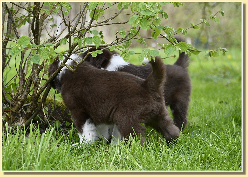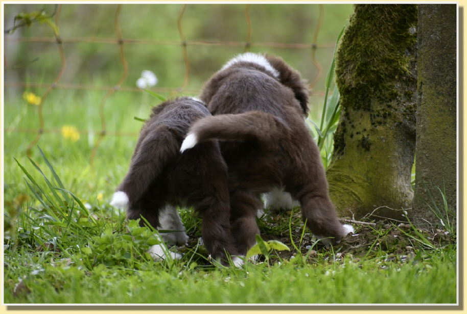 Am Sonntag wurden Susys kleine Prömmelchen schon 6 Wochen alt und sie sind einfach nur klasse! Selbstbewusst haben sie heute, nach dem Fotoshooting, schon große Teile vom Garten erkundet und auch der gemeinsame Welpenauslauf wird nun nach und nach mit den verschiedenen Spielgeräten, Krachmachern und Überraschungen bestückt! Wir setzen da aber nicht unbedingt immer auf aufwendig gestaltete Spielgeräte, sondern auf z.B. Baumstümpfe zum Klettern, Eimer, die furchtbar Krach machen, wenn sie die Pflastersteine entlang rollen, leere Futtertüten in die man klettern kann, Bretter zum Balancieren usw.. Den Kleinen macht es Spaß, immer etwas Neues zu entdecken und gleichzeitig machen wir sie dadurch mit vielen verschiedenen Geräuschen und Situationen vertraut.