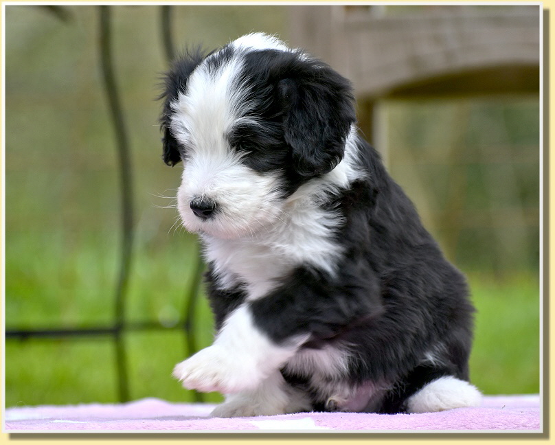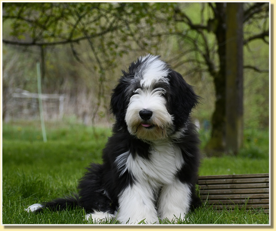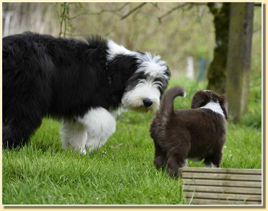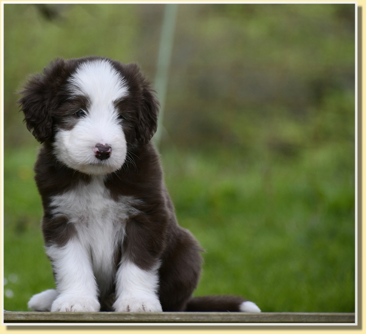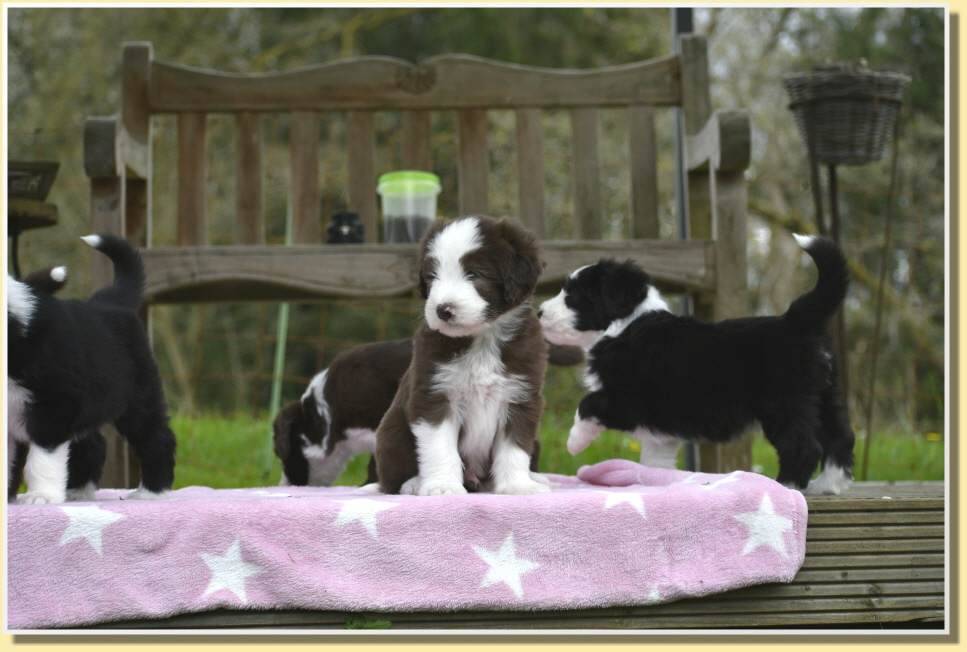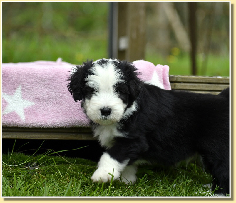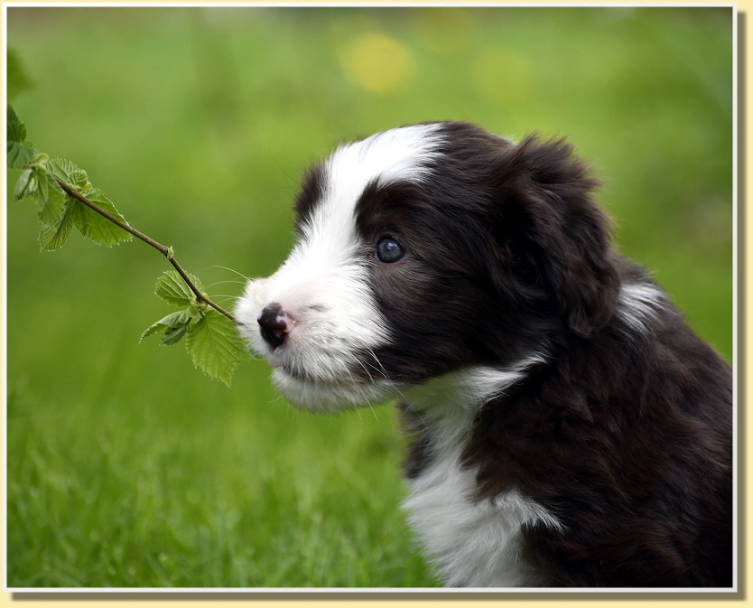 Am Sonntag wurden Susys kleine Prömmelchen schon 6 Wochen alt und sie sind einfach nur klasse! Selbstbewusst haben sie heute, nach dem Fotoshooting, schon große Teile vom Garten erkundet und auch der gemeinsame Welpenauslauf wird nun nach und nach mit den verschiedenen Spielgeräten, Krachmachern und Überraschungen bestückt! Wir setzen da aber nicht unbedingt immer auf aufwendig gestaltete Spielgeräte, sondern auf z.B. Baumstümpfe zum Klettern, Eimer, die furchtbar Krach machen, wenn sie die Pflastersteine entlang rollen, leere Futtertüten in die man klettern kann, Bretter zum Balancieren usw.. Den Kleinen macht es Spaß, immer etwas Neues zu entdecken und gleichzeitig machen wir sie dadurch mit vielen verschiedenen Geräuschen und Situationen vertraut.