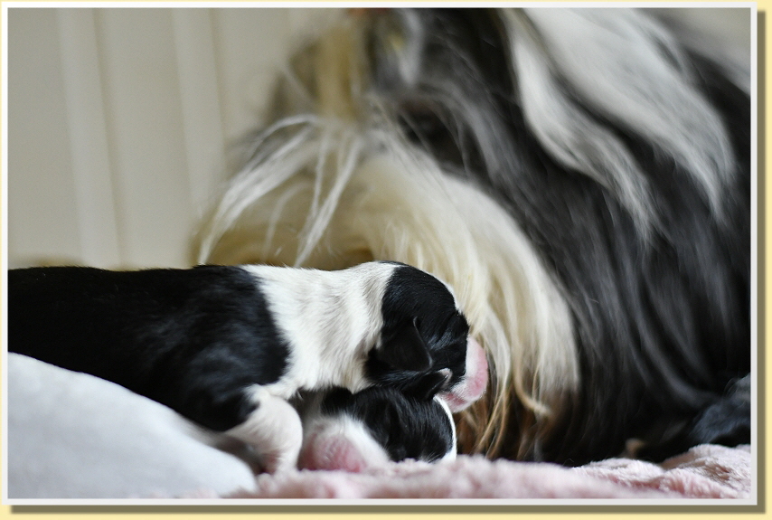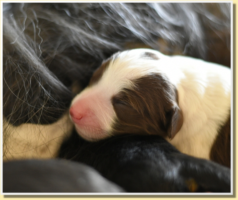 Leelly liegt glücklich und zufrieden bei ihren kleinen Wonneproppen und die machen nichts anderes als trinken und schlafen. Sie haben alle schon gut zugenommen und sind satt und zufrieden.