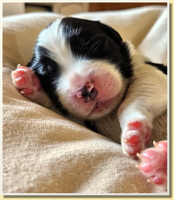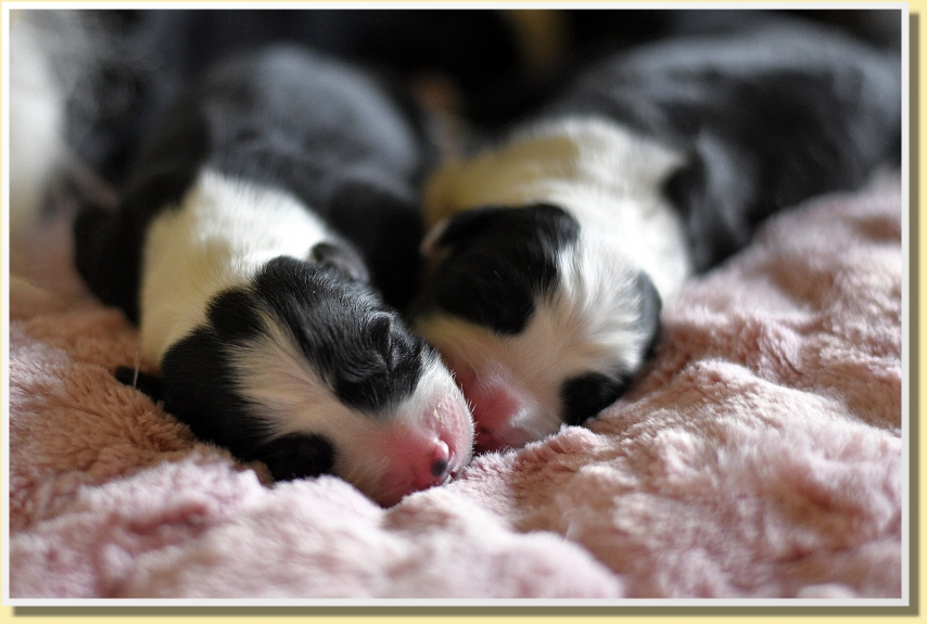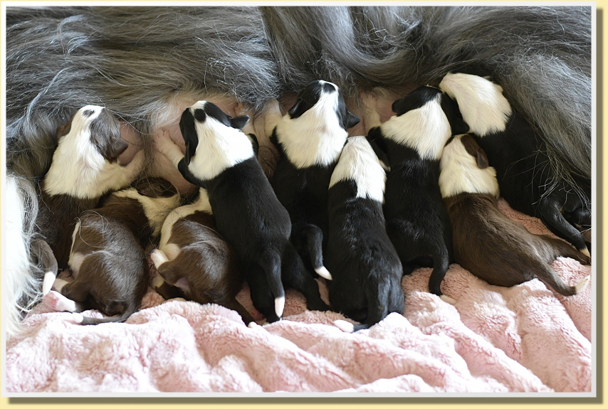 Es sind 6 Jungs und 3 Mädchen mit Geburtsgewichten zwischen 350g und 410g, was für 9 Welpen sehr hohe Gewichte sind und die hatte man ihr aber auch angesehen! Alle sind putzmunter, fit und herzallerliebst!